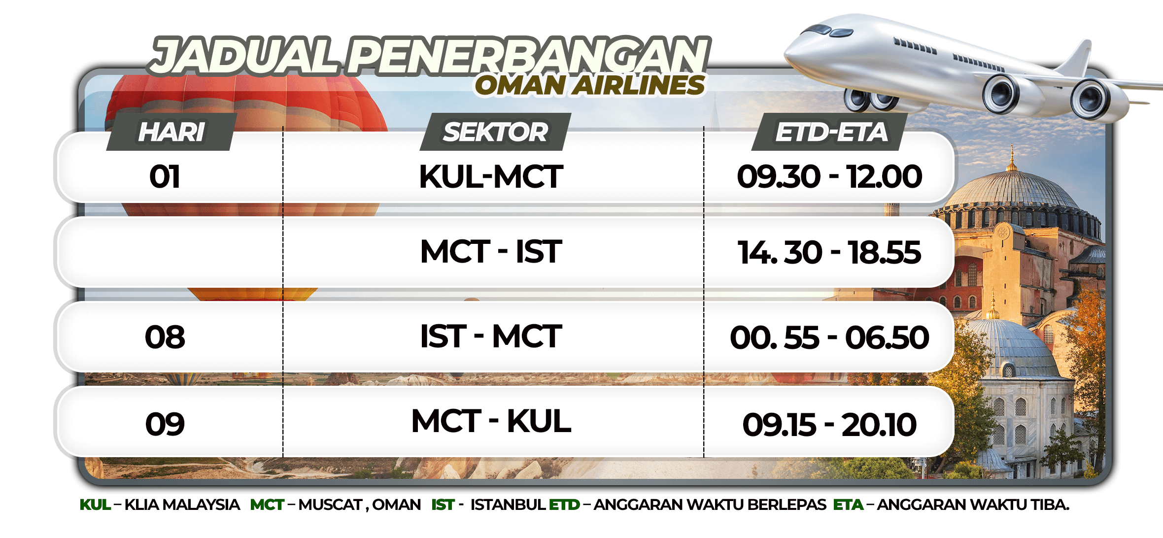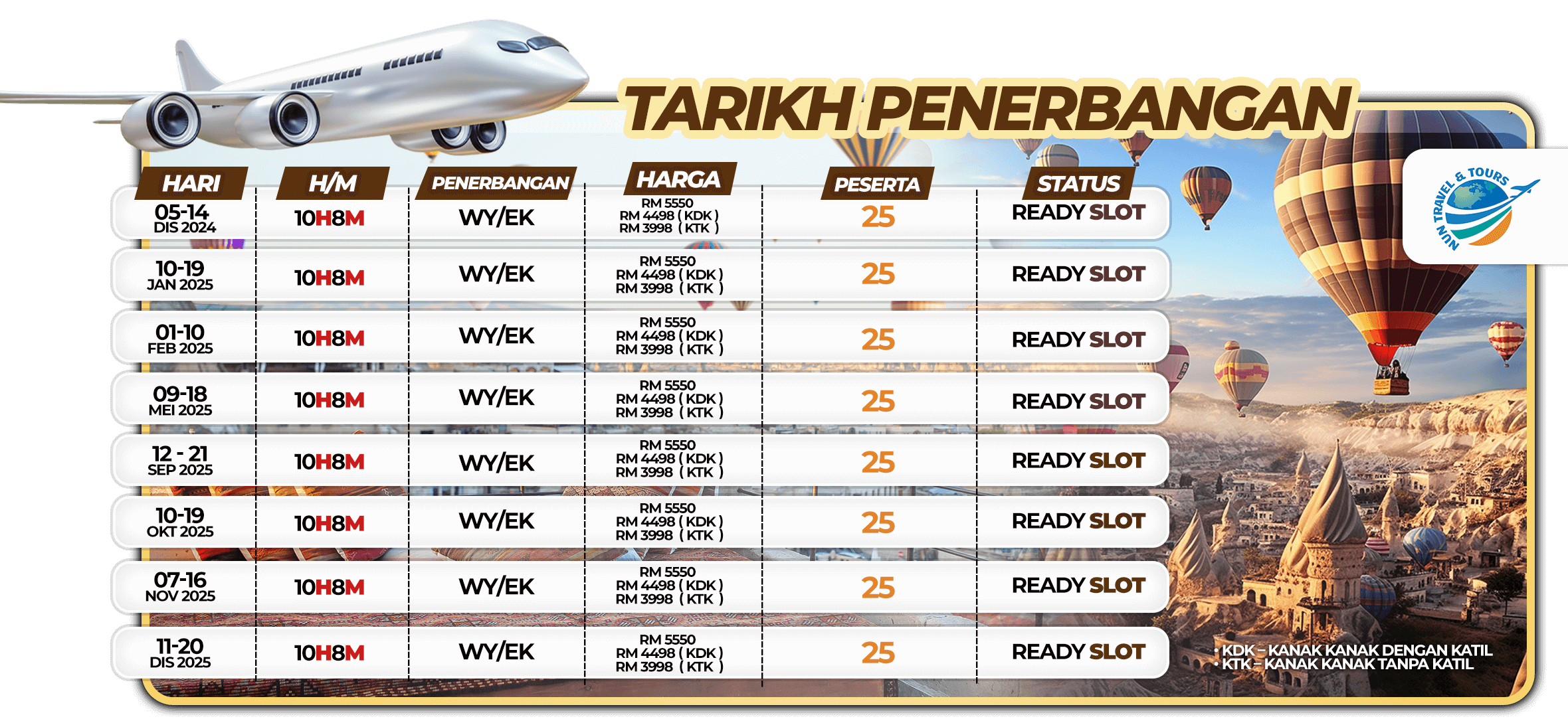 - Tambahan RM300.00 untuk Pakej pada Musim Cuti Sekolah atau Musim Panas di Turki.