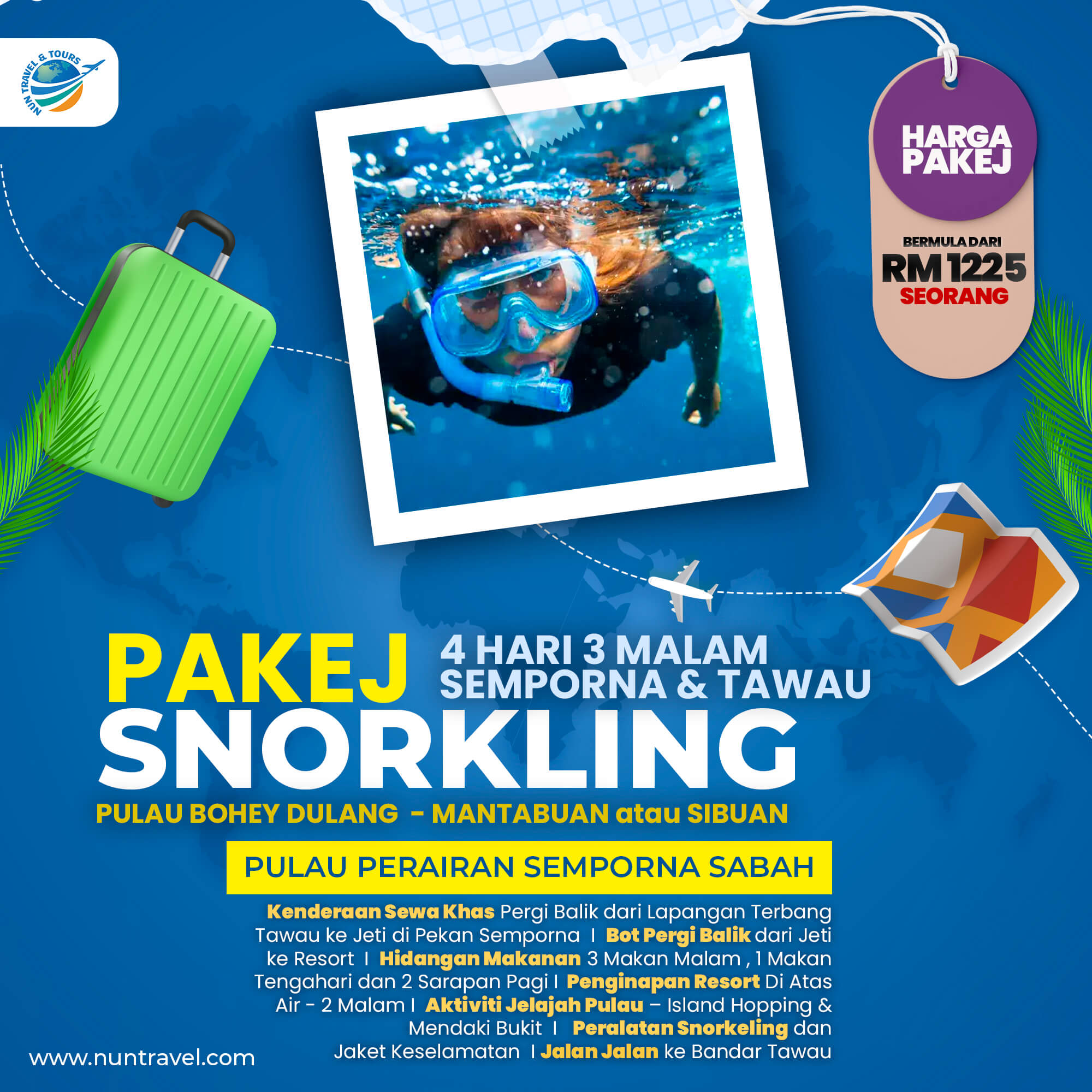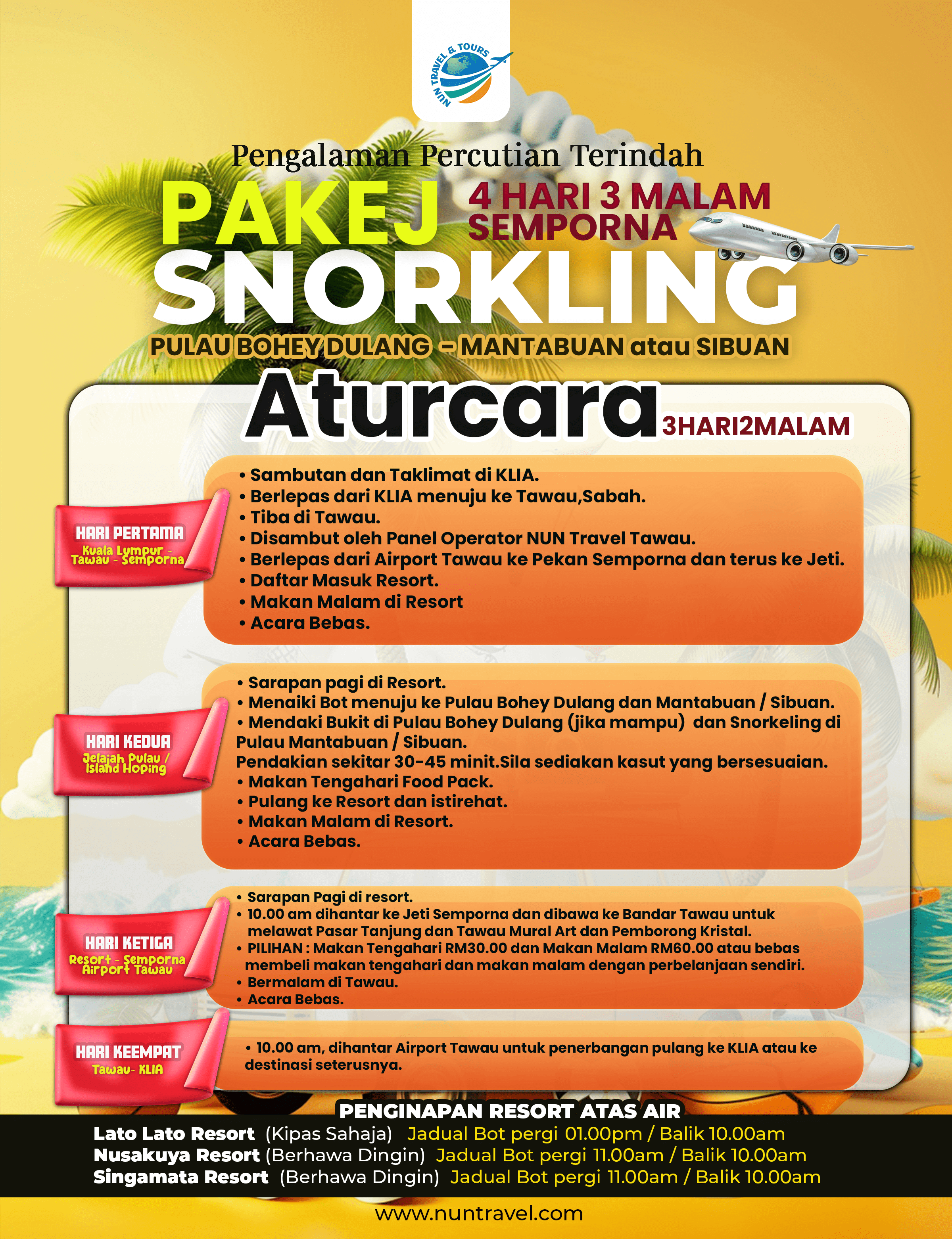 - Anda dicadangkan mengambil penerbangan pergi ke Tawau sehari lebih awal dari Aturcara dan bermalam di Pekan Semporna untuk mengelakkan terlepas Bot pergi ke resort yang dijadualkan di waktu pagi. (Penginapan tambahan di Semporna tidak termasuk dalam tawaran Pakej)