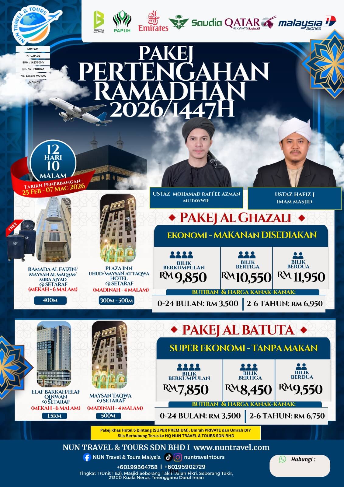 Dari saat anda meninggalkan rumah hingga anda pulang dengan selamat, kami telah merancang setiap aspek perjalanan anda dengan teliti. Kami menyediakan aturcara umrah yang lengkap termasuk pengurusan visa, pengangkutan di Tanah Suci, makanan halal dan nutrisi yang seimbang, serta aktiviti rohani yang akan memperkaya pengalaman anda. Bersama Nun Travel and Tours, anda hanya perlu fokus pada ibadah dan penghayatan rohani.