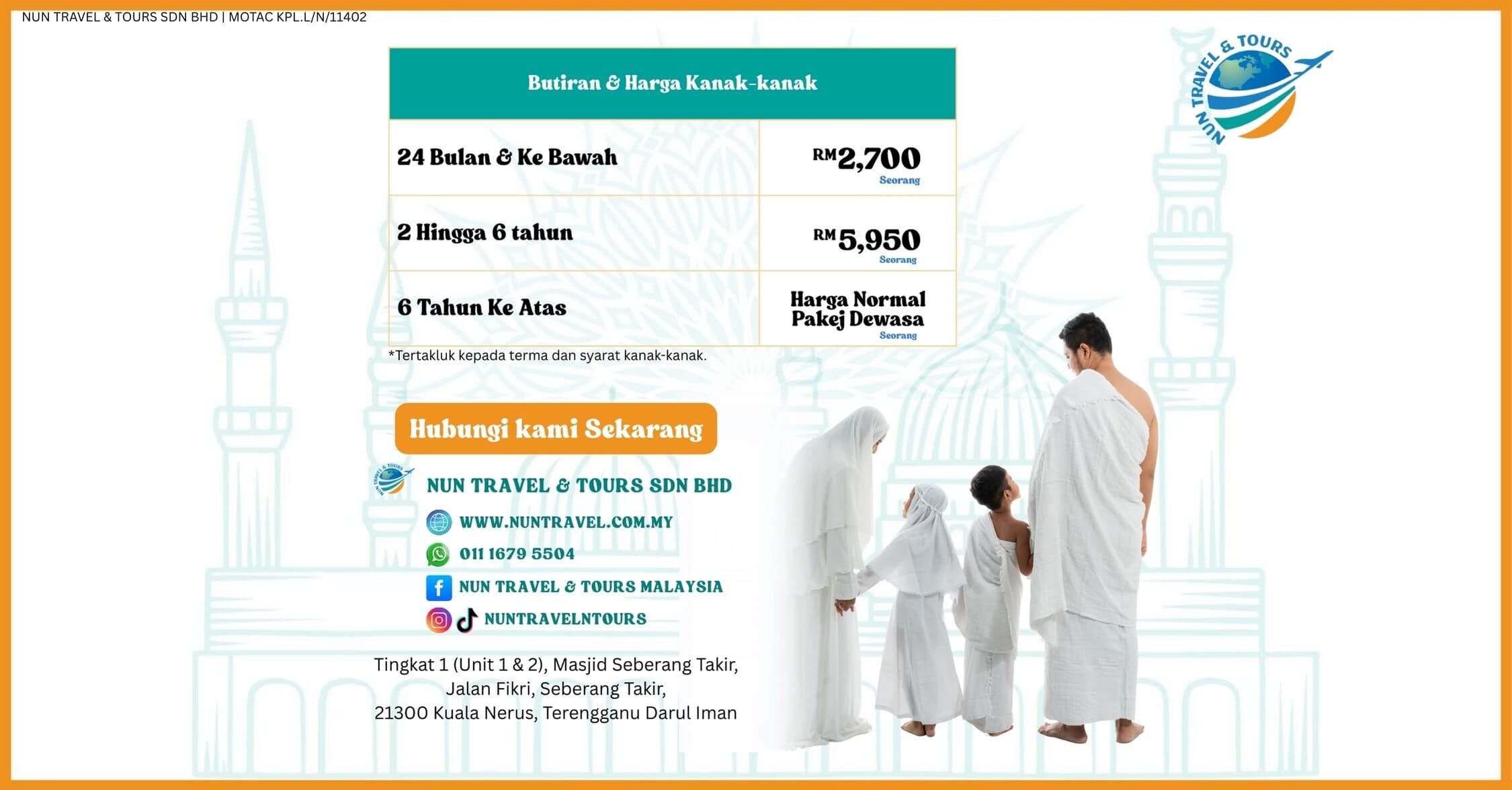 Nun Travel and Tours mengajak anda merasai pengalaman Umrah yang tak ternilai – Kami di Nun Travel and Tours memahami bahawa menunaikan umrah merupakan impian setiap umat Islam yang ingin mendekatkan diri kepada Pencipta. Dengan itu, kami dengan bangganya mempersembahkan Pakej Umrah yang bukan sahaja berbaloi tetapi juga memenuhi semua keperluan anda dari segi keselesaan dan keperluan rohani.