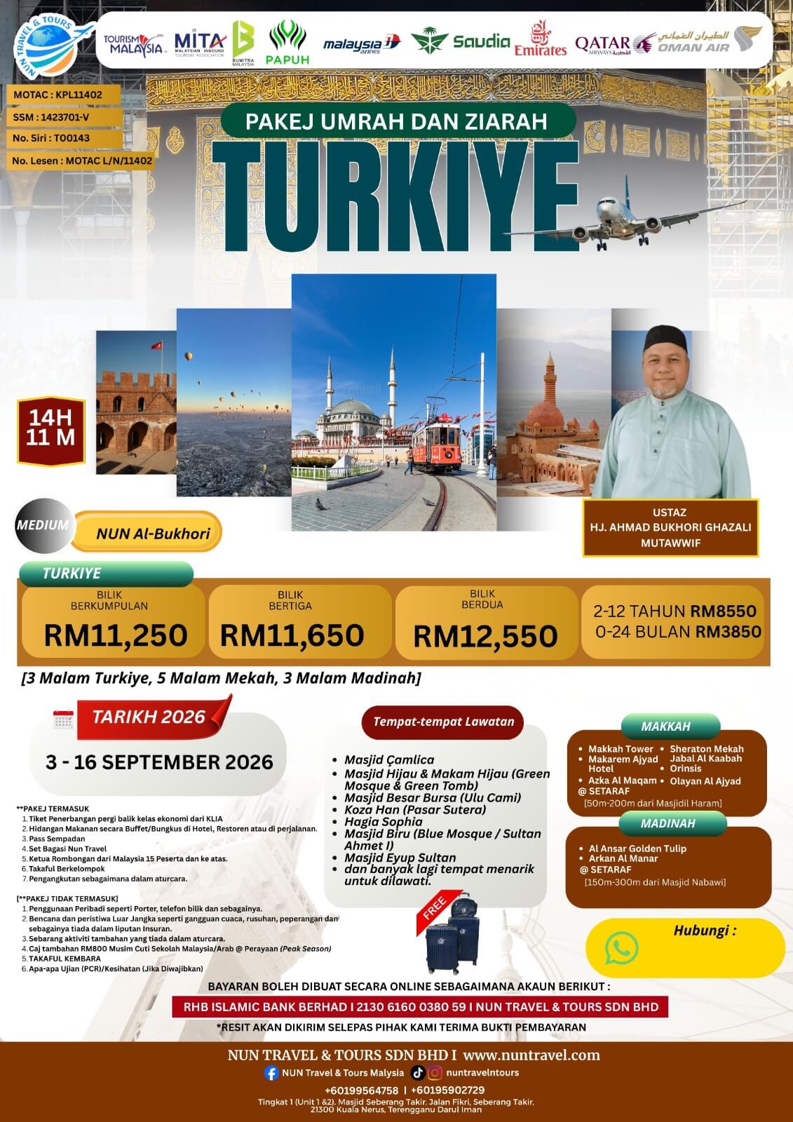 - Pembayaran boleh dibuat menggunakan wang tunai/perbankan atas talian/cek/draft bank di atas nama NUN TRAVEL & TOURS SDN BHD melalui no. akaun Bank RHB ISLAMIC BANK BERHAD : 21306160038059.